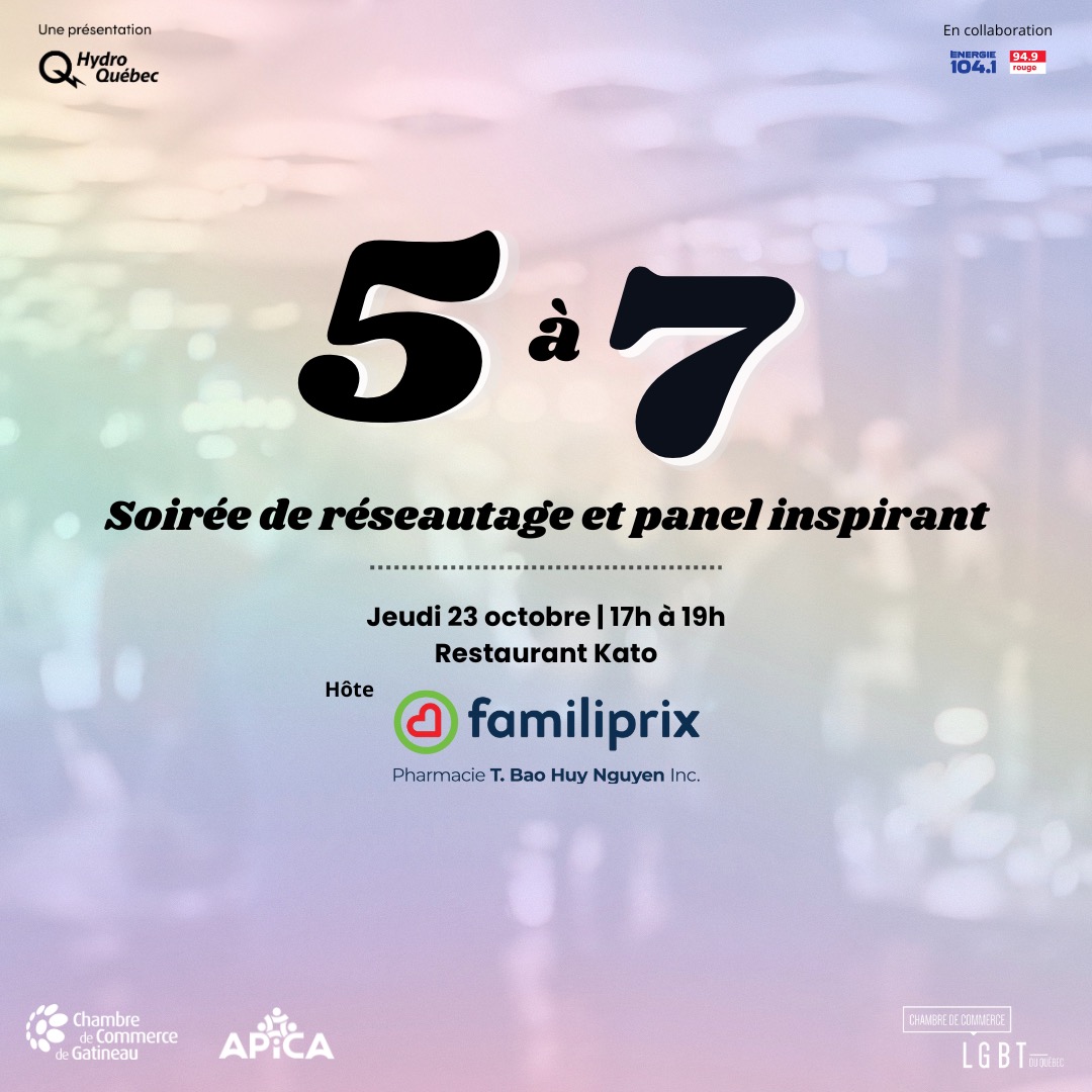 Joignez-vous à nous et le Familiprix – T. Bao Huy Nguyen le 23 octobre prochain pour un 5 à 7 Conjoint avec l’APICA au KaTO, situé dans le Château Cartier Hôtel & Resort! Cet événement, présenté par Hydro-Québec en collaboration avec Énergie 104.1 FM et Rouge 94.9 FM, sera l’occasion de célébrer le passage dans la région de la Chambre de Commerce LGBT du Québec. Venez réseauter et célébrer avec vous! Date : Jeudi 23 octobre 2025 Heure : 17 h 00 à 19 h 00 Endroit : KATO | Château Cartier Hôtel & Resort Adresse : 1170 Chem. d’Aylmer Suite 100, Gatineau, Quebec J9H 7L1